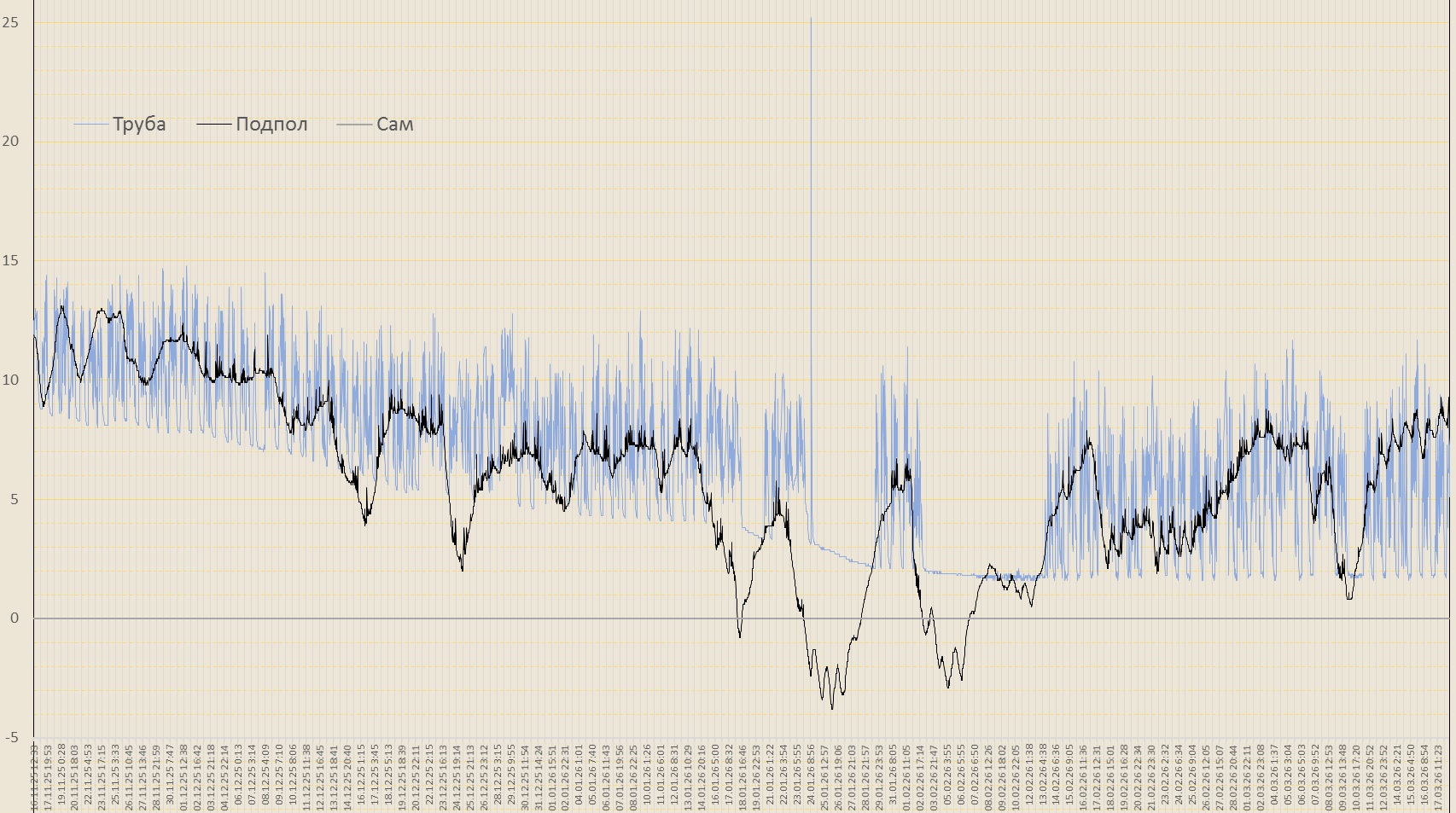 График изменений температур трубы и подпола за зимний сезон 2025-2026 годов