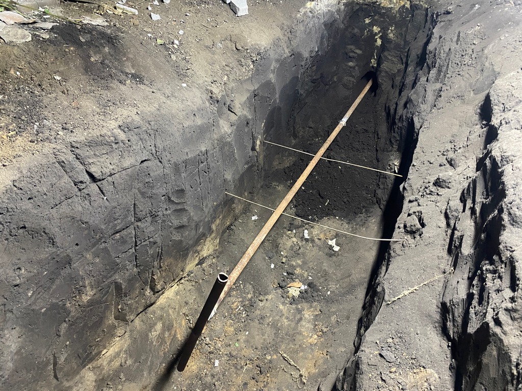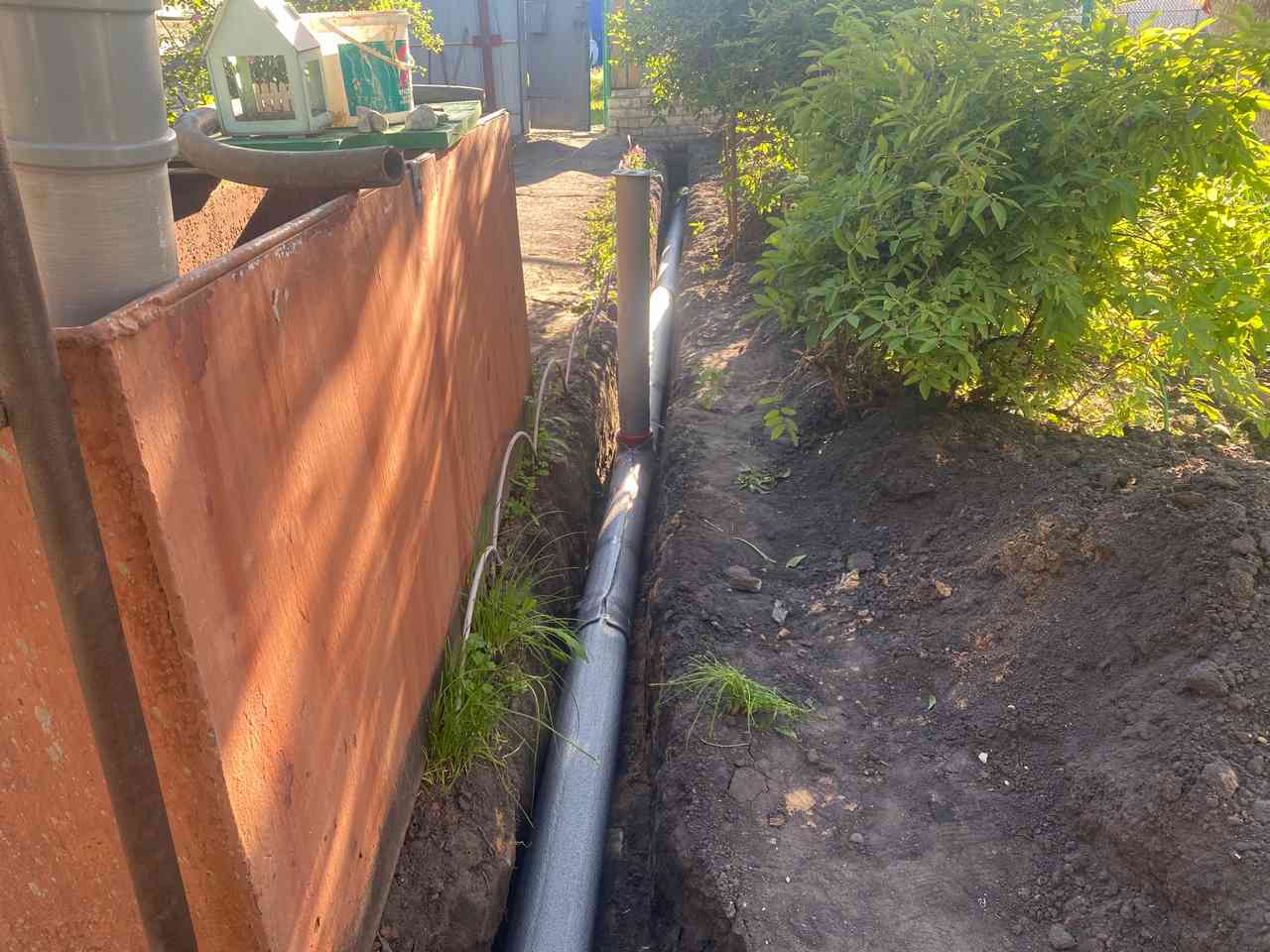 Выкопал траншею, установил маячки по уровню (уклон на 1м 3см), присыпал траншею глиной