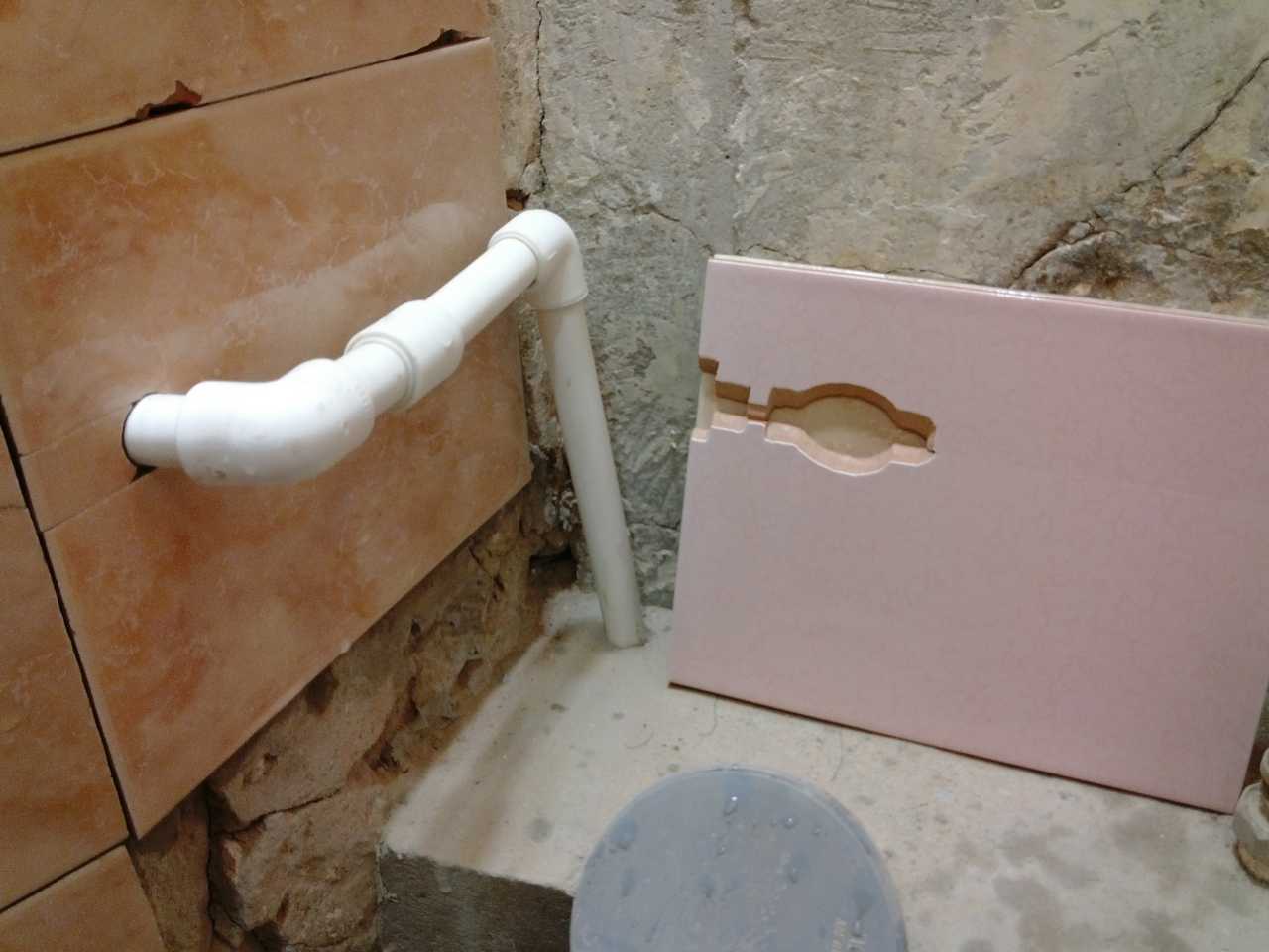 Вырезал в плитке отверстие под кран (он к стене близко), а так же прилепил кусочек у трубы ХВС.